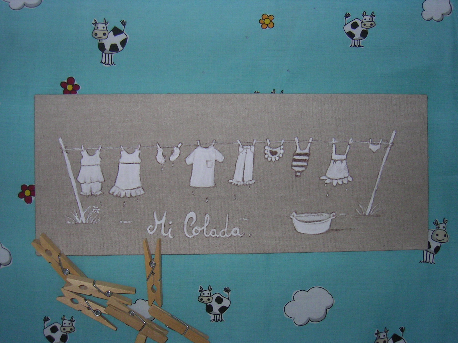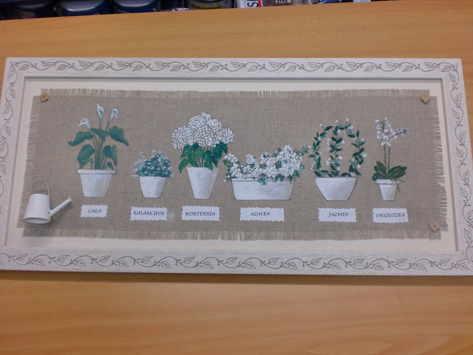 Cuadro pintado sobre lino, con complementos, regadera metalica. Enmarcado.