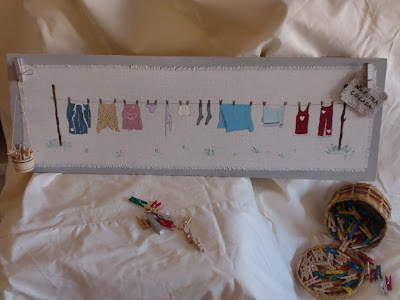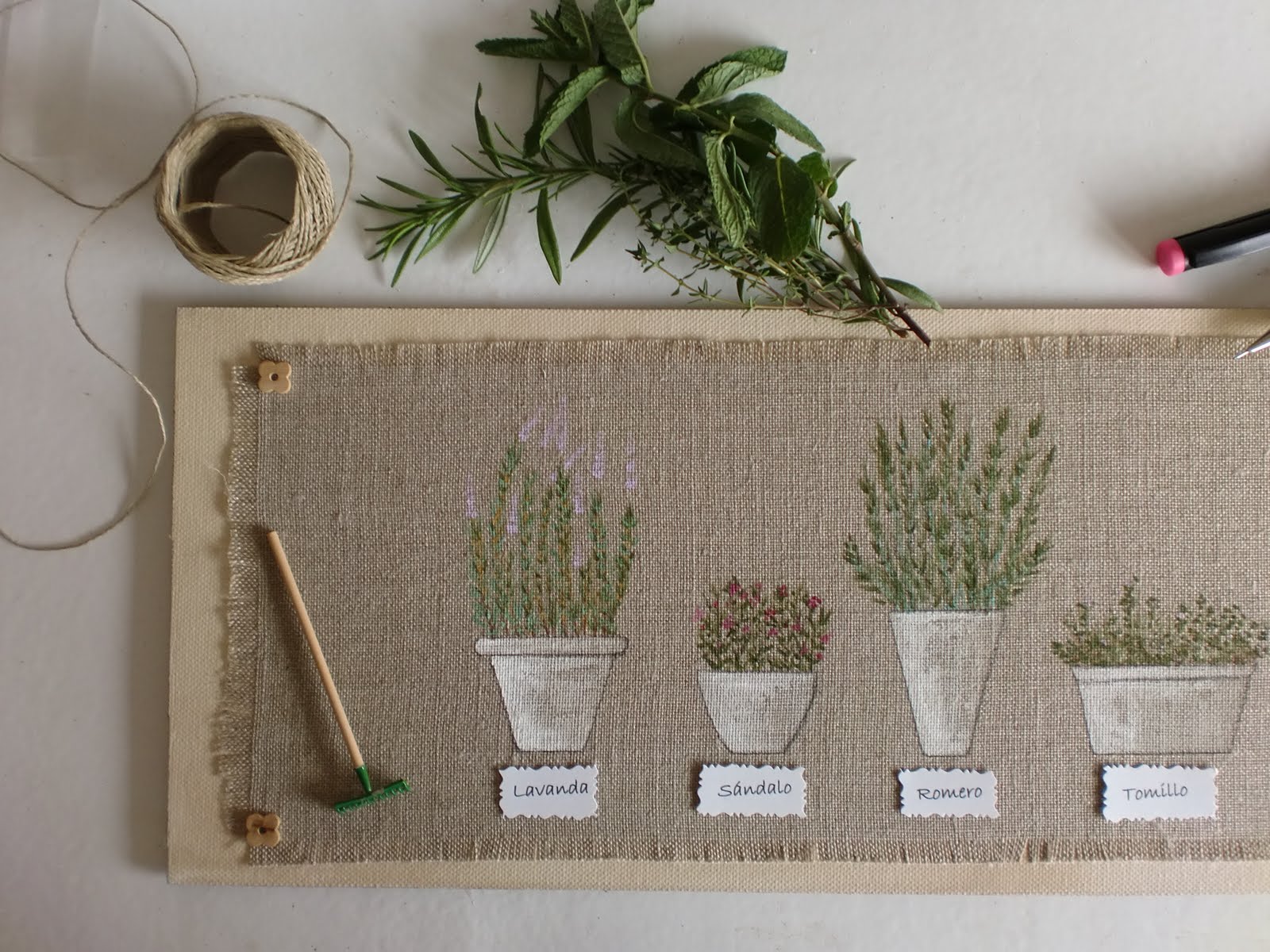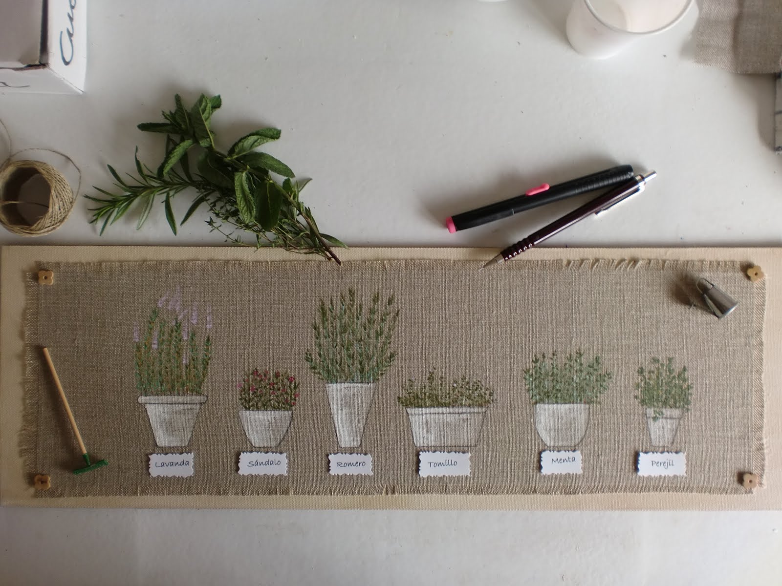 Cuadro pintado a mano, sobre lino y complementos como regadera metalico y herramienta de jardineria en miniatura. Sin enmarcar.